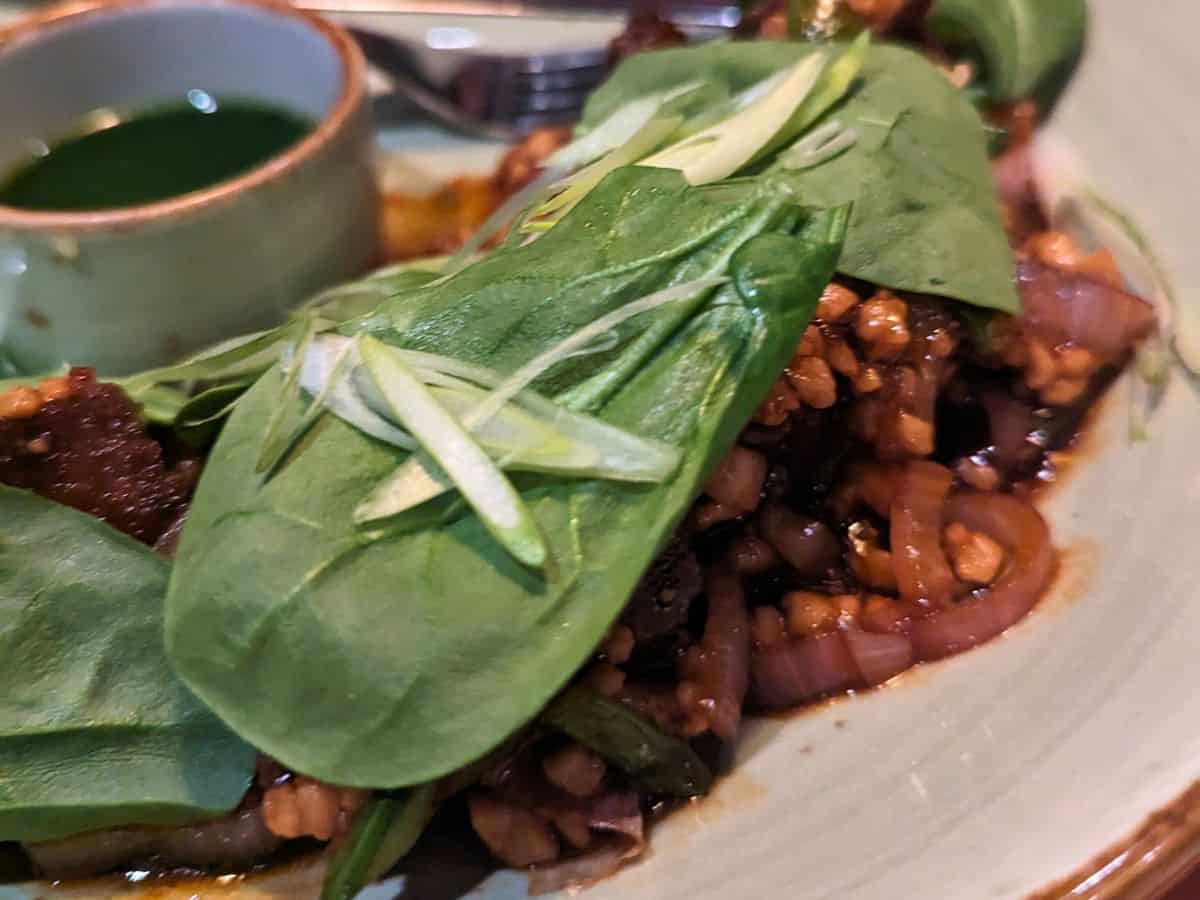 I’m so glad we ordered the the jade shrimp har gow (shrimp bonnets), which like the soup had plenty of flavor without heat. We almost skipped those since we already had potstickers, but they ended up a fan favorite.