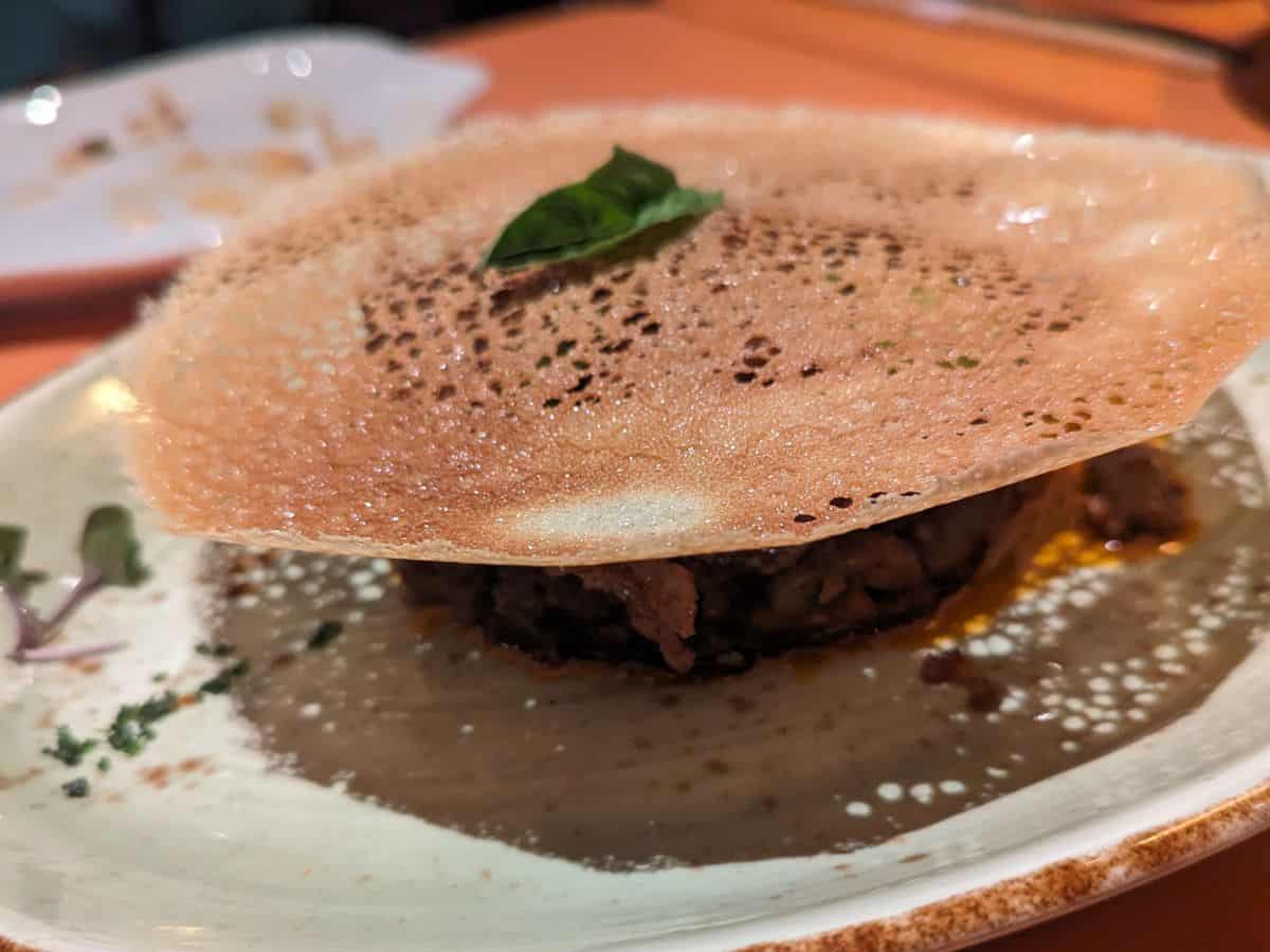 Lastly, we also tried the chicken spring rolls. We expected spring roll paper, but found them slightly more reminiscent of egg rolls in texture. These were good but not our favorite. The spring rolls also had lemon marmalade, curry leaves, pink grapefruit, and cilantro pearls dotting the plate.