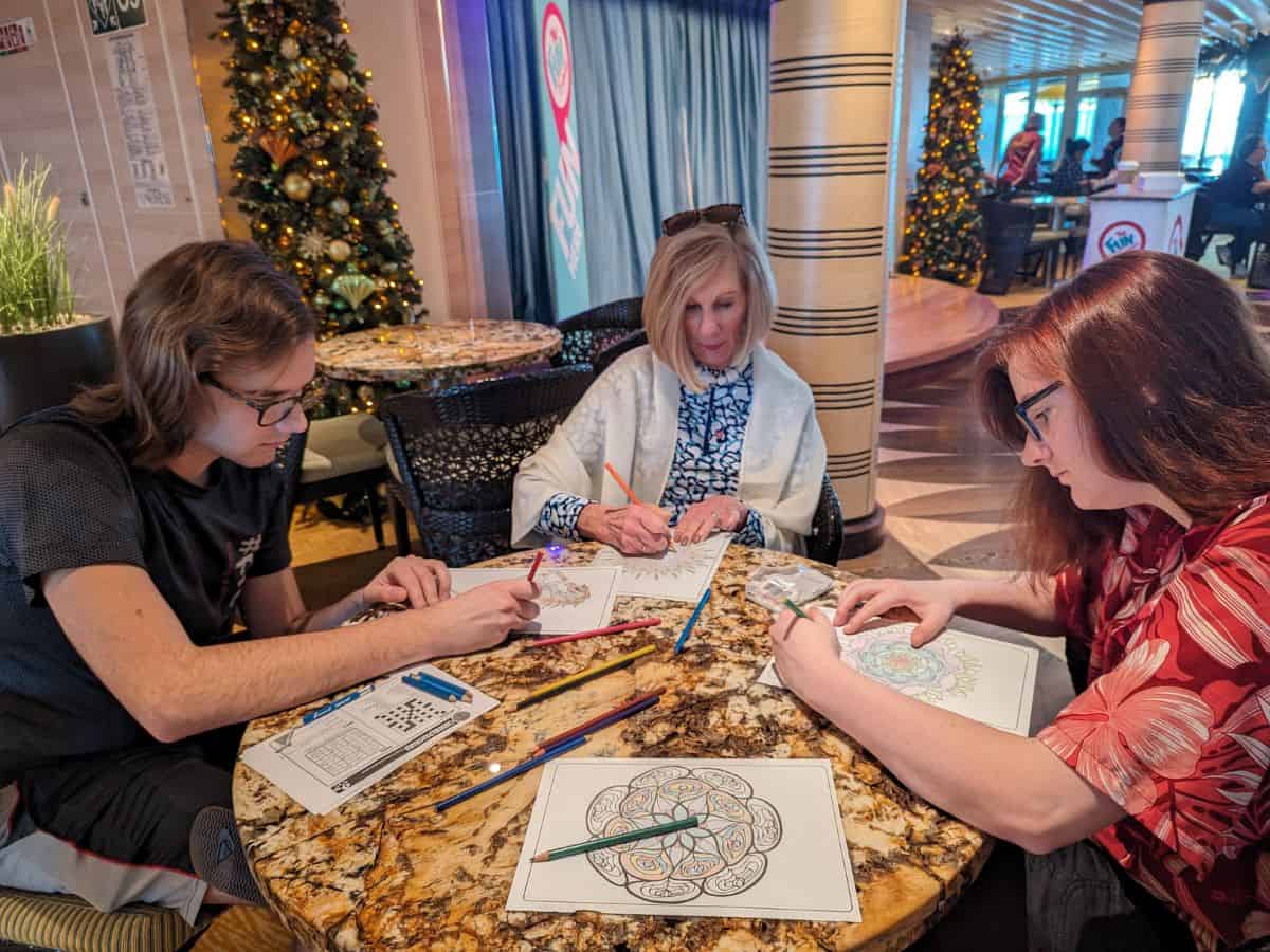 We also enjoyed the sea day coloring, although a half hour was never long enough for us to complete our mandala and we do miss the Michael’s craft projects they used to offer. If you’re interested in art auctions, they have them regularly, as well.