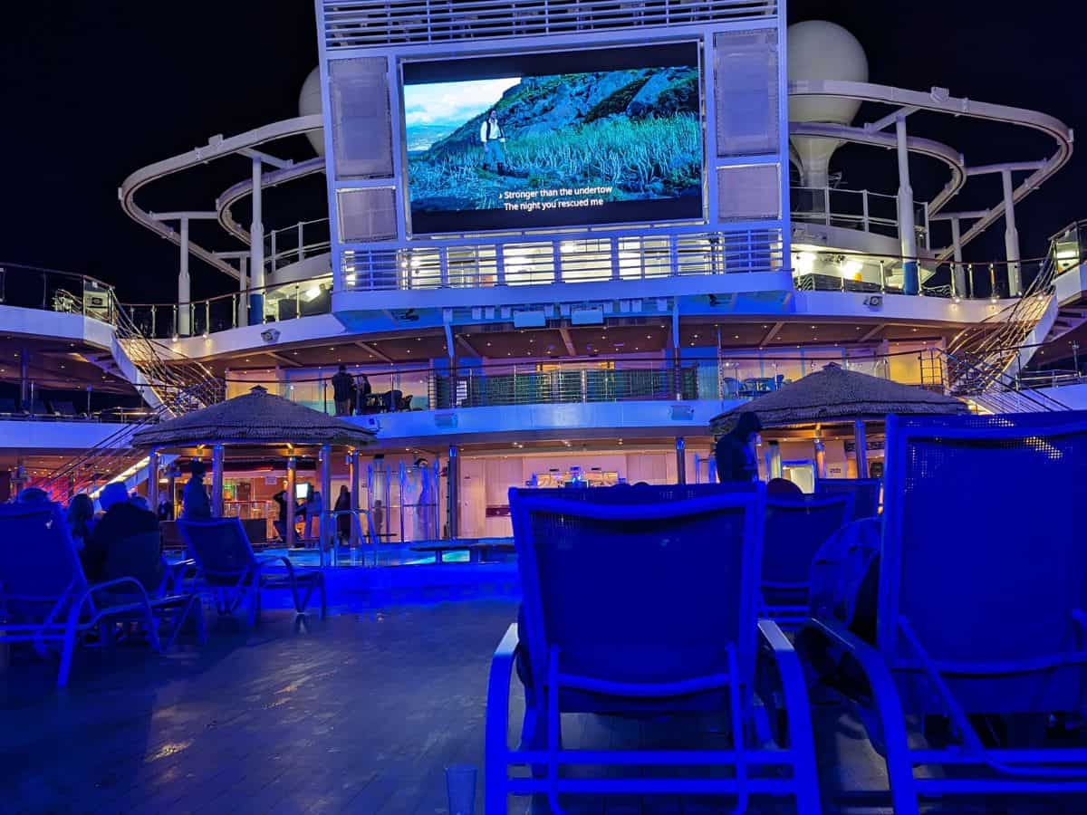 Our favorite evening entertainment is the Dive In Movie. Near the pool, the screen shows recent movies, generally two per night, although this varies by itinerary and movie length.