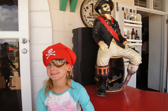 Once we found our tour, we boarded a small shuttle bus that brought us to the port where the Jolly Roger was moored. After a quick walk and a stop to pick up wristbands to board the Jolly Roger (in a tavern with a conveniently located gift shop), we were ready to board our ship. Before we got there, a crew member handed each of the wee ones a pirate getup. Little Miss immediately pulled hers out and put it on, while Mister Man is saving his for “later.”