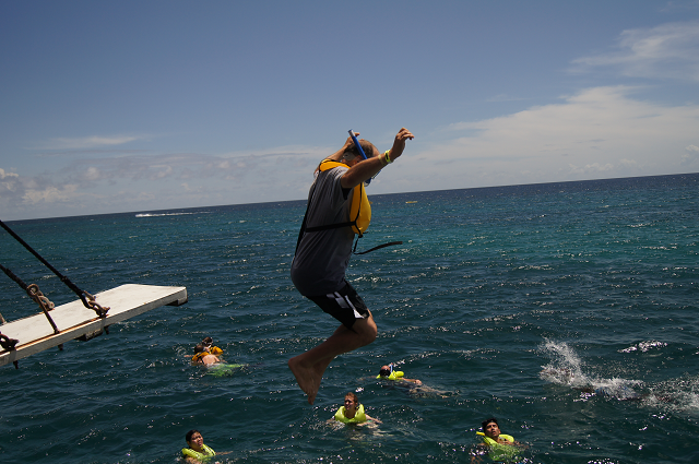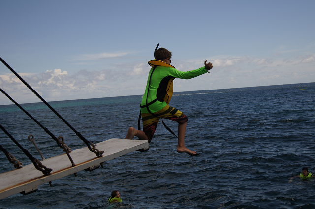 After that, everyone who wanted to got into the action and walked the plank. This included the wee ones, my husband, and I. After awhile, it became a diving competition amongst the passengers, and we found some truly competent divers in the bunch. We only walked the plank once given the line, however.