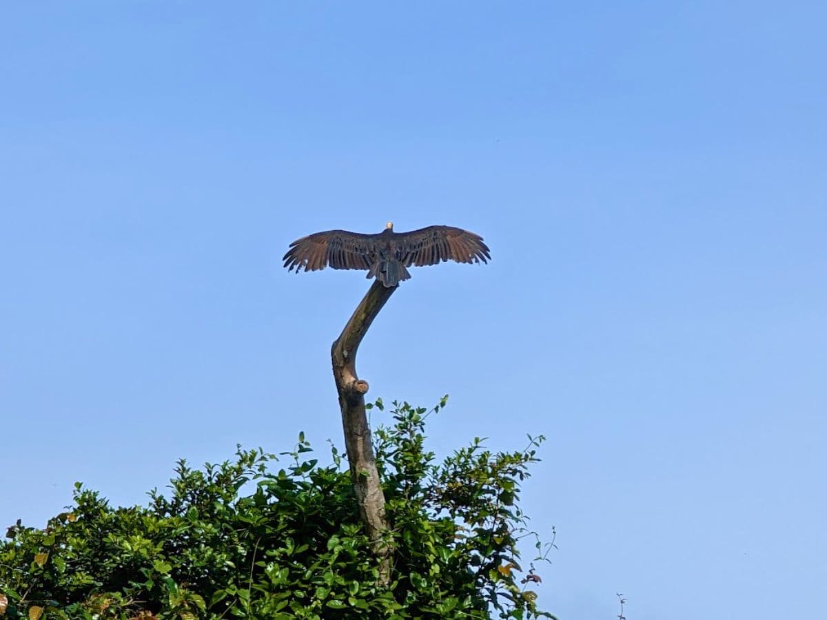 A large bird with wings spread perches at the top of a bare tree branch, above green foliage and beneath a clear blue sky—an iconic scene along the delfin amazon cruise route.