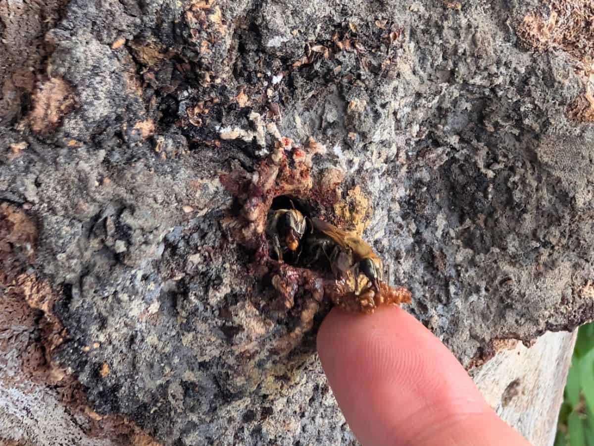 A finger touches the edge of a small hole in tree bark, with bees visible inside the hole—capturing a moment of discovery reminiscent of nature excursions on a Delfin Amazon cruise.