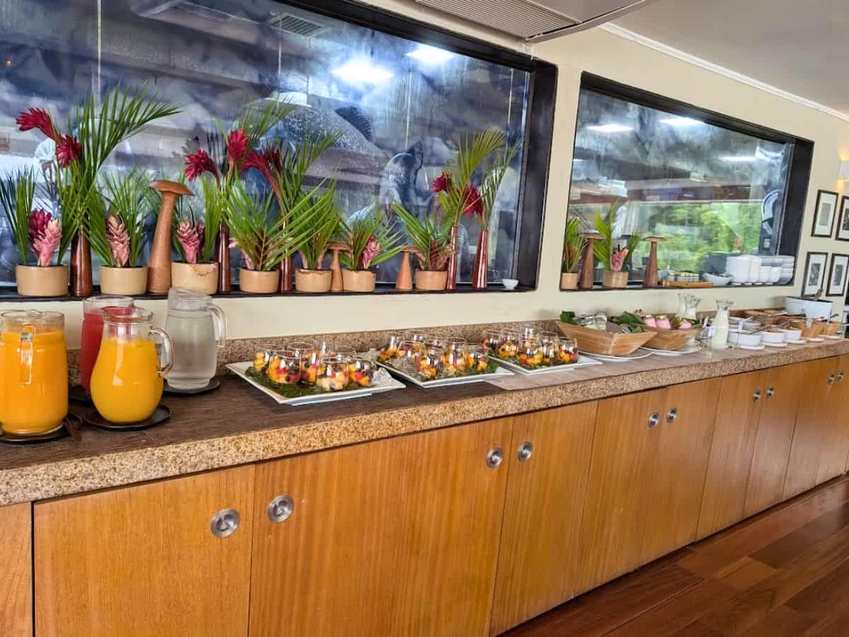 A buffet setup on a granite countertop aboard the Delfin Amazon Cruise features juice pitchers, assorted appetizers, plates, and utensils; tropical plants in pots line the window above.