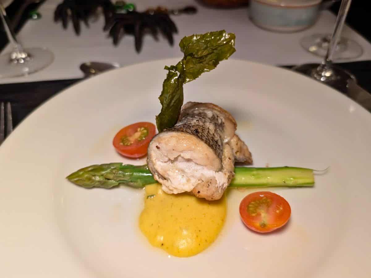 A piece of cooked fish served on an asparagus spear with yellow sauce, cherry tomato halves, and a leafy garnish on a white plate—an elegant dish you might savor aboard a Delfin Amazon River Cruise, the ultimate bucket list experience.