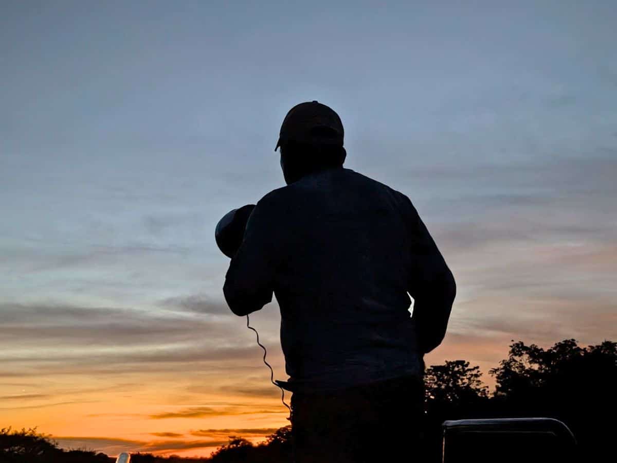 A person in silhouette holding a handheld spotlight stands outdoors at sunset, reminiscent of evenings on a Delfin Amazon Cruise, with trees visible against the colorful sky.