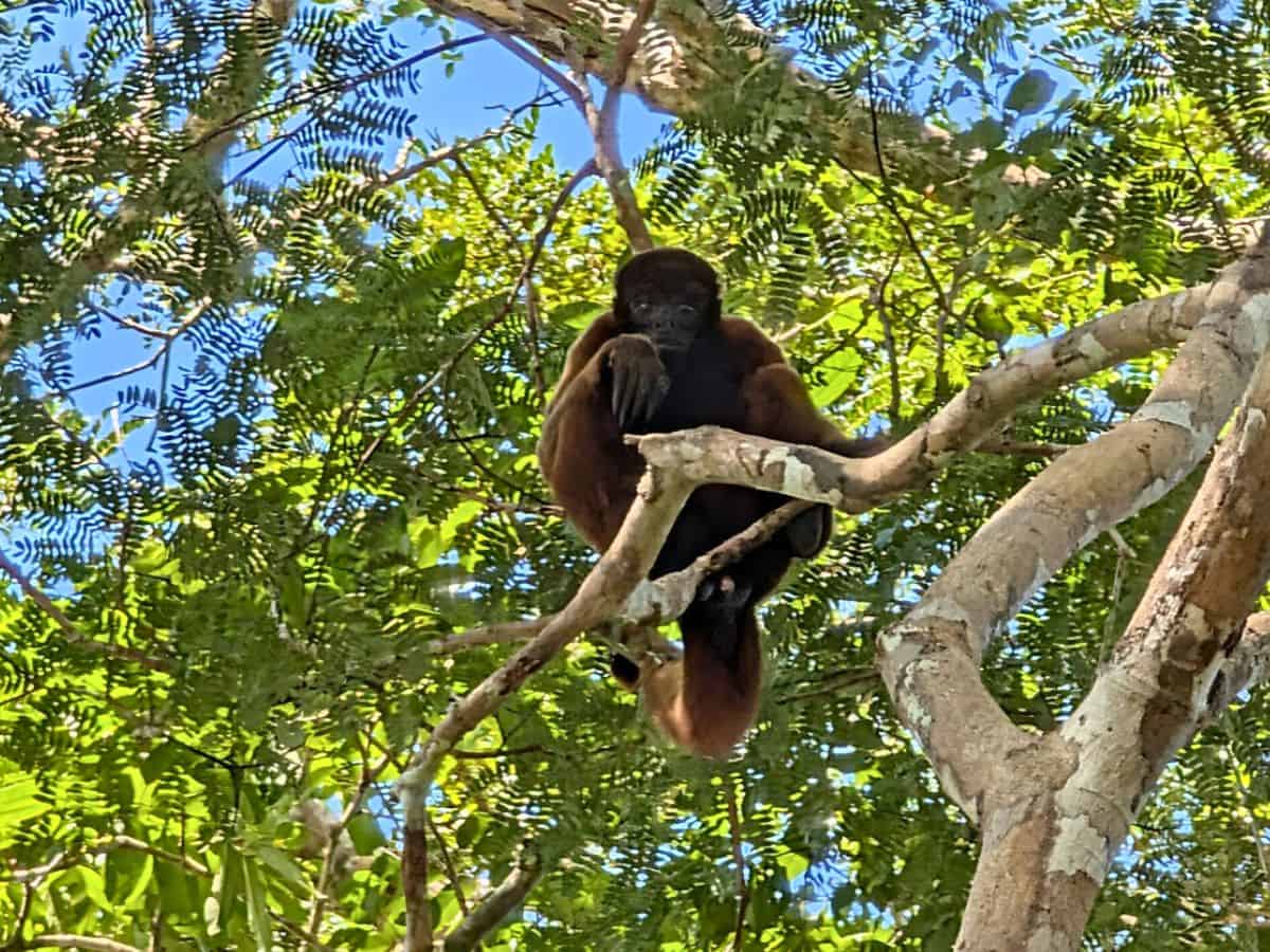 A howler monkey sits on a tree branch surrounded by green leaves and sunlight, looking down with one arm resting on its leg—an enchanting sight often glimpsed during a Delfin Amazon Cruise.