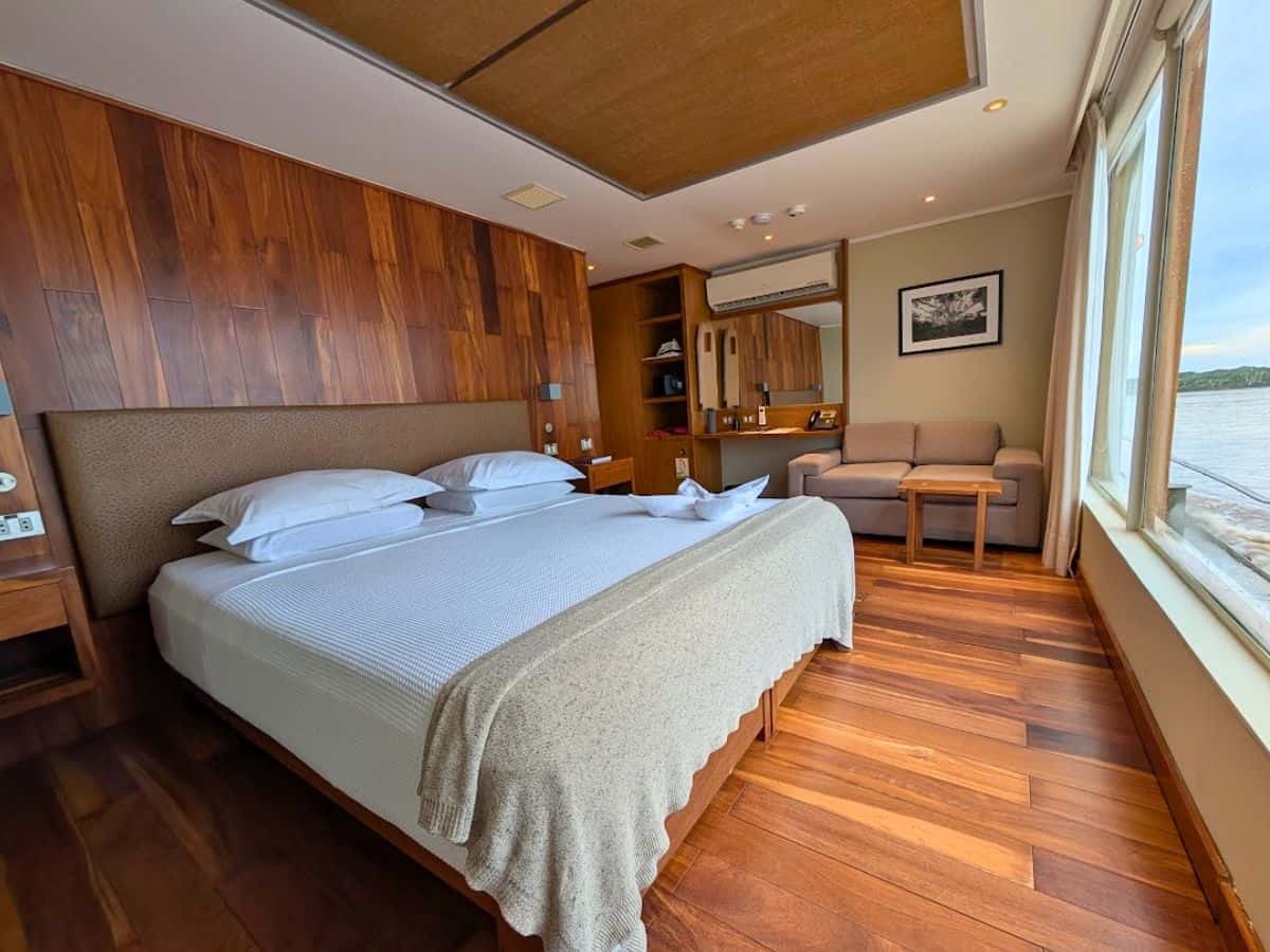 A hotel room with a double bed, a sofa, wooden flooring, a wall-mounted TV, a desk, and a large window overlooking water—perfect for dreaming about your next bucket list adventure like an Amazon River cruise.