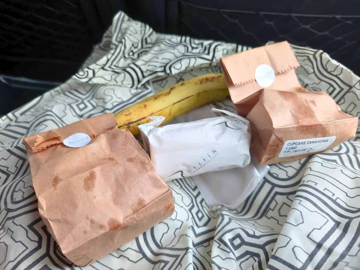 We also received a boxed lunch in the same style napkin we had on the bus when we first arrived, and we keep that napkin, as well. Pick up your lunch and your choice of beverage after you drop your luggage because you can take liquids through security because it’s a domestic flight to Lima, something I didn’t realize at first.