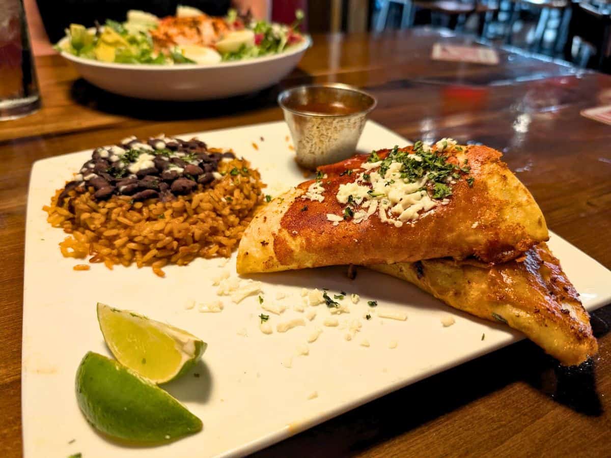 I chose the dipping tacos that have pulled pork but otherwise are reminiscent of a quesabirria taco (yes, I have a problem), and they were great. My friend opted for a lighter Cobb salad, and it was exactly what you would expect.