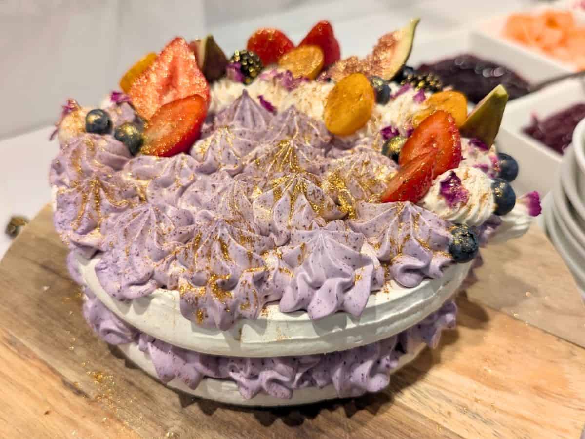A cake topped with purple and white whipped frosting, gold dust, strawberries, blueberries, figs, and small orange fruits sits on a wooden board—perfect for a luxury river cruise or riverside celebration.