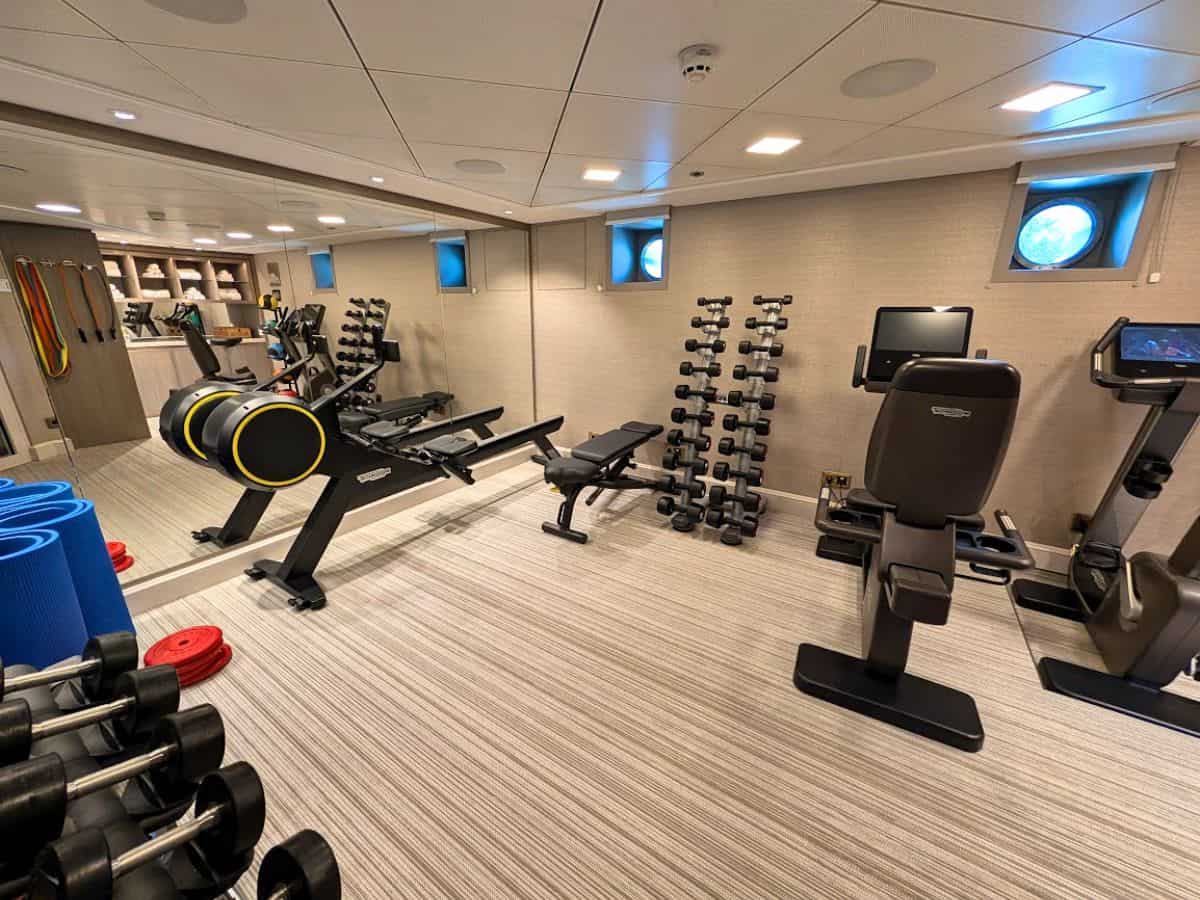 Small gym room with exercise equipment including benches, dumbbells, resistance bands, a stationary bike, treadmill, and mirrored wall—perfect for staying active during your luxury river cruise with Riverside.