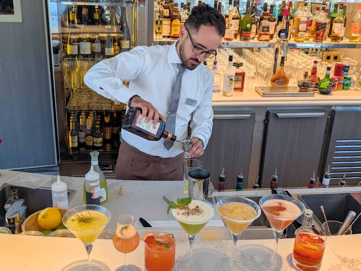A bartender in a white shirt and tie pours liquor into a shaker behind a Riverside bar, with various colorful cocktails displayed in front of him, evoking the elegance of a luxury river cruise experience.