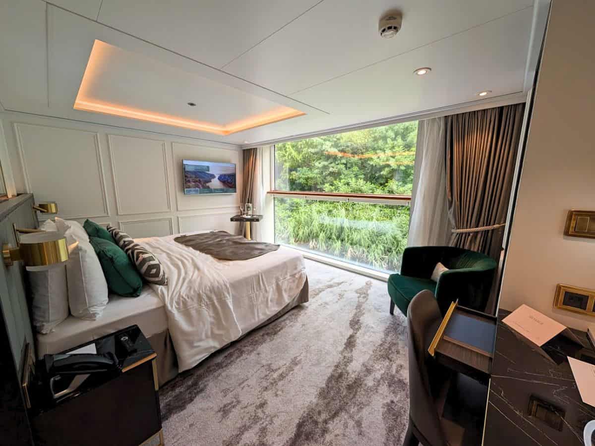 All rooms face the river, and the floor-to-ceiling window that runs the entire length of the cabin opens. You can either open it entirely to the fresh air or have a screen to keep everything but the weather out.