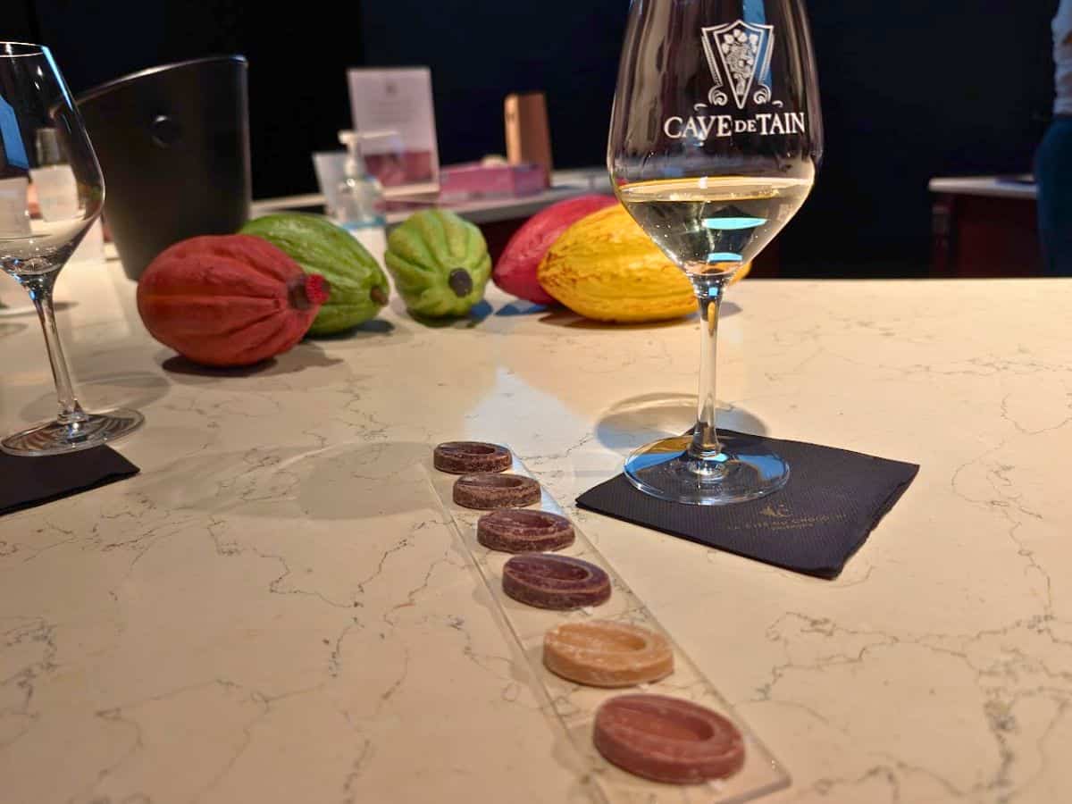 A glass of white wine is placed on a marble counter aboard a Riverside luxury river cruise, next to a row of assorted chocolates and three colorful cacao pods.