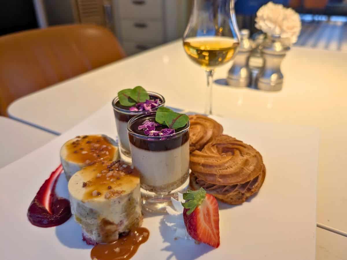 A white plate with assorted desserts, including two mousse cups, a cake slice with sauce, a cookie, a halved strawberry, and a glass of amber liquid on the table during a luxury river cruise.