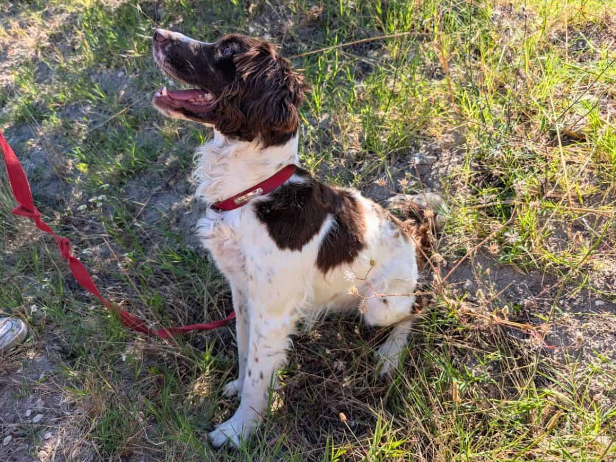 A brown and white dog with a red collar and leash sits on grass and dirt by the riverside, looking up with its mouth open.
