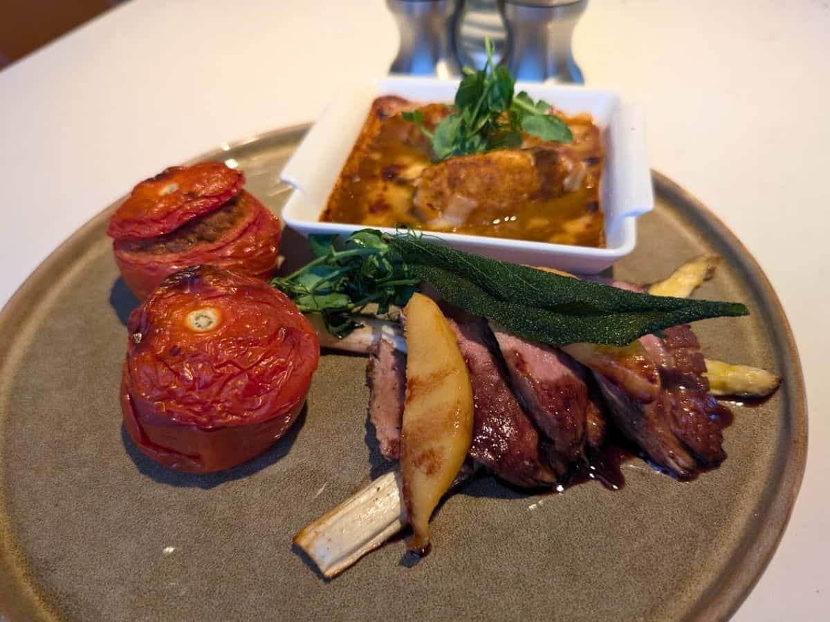 A plated meal on a luxury river cruise features stuffed tomatoes, sliced lamb chops with pear, fried sage, and a small casserole dish garnished with herbs—perfect for riverside dining in style.