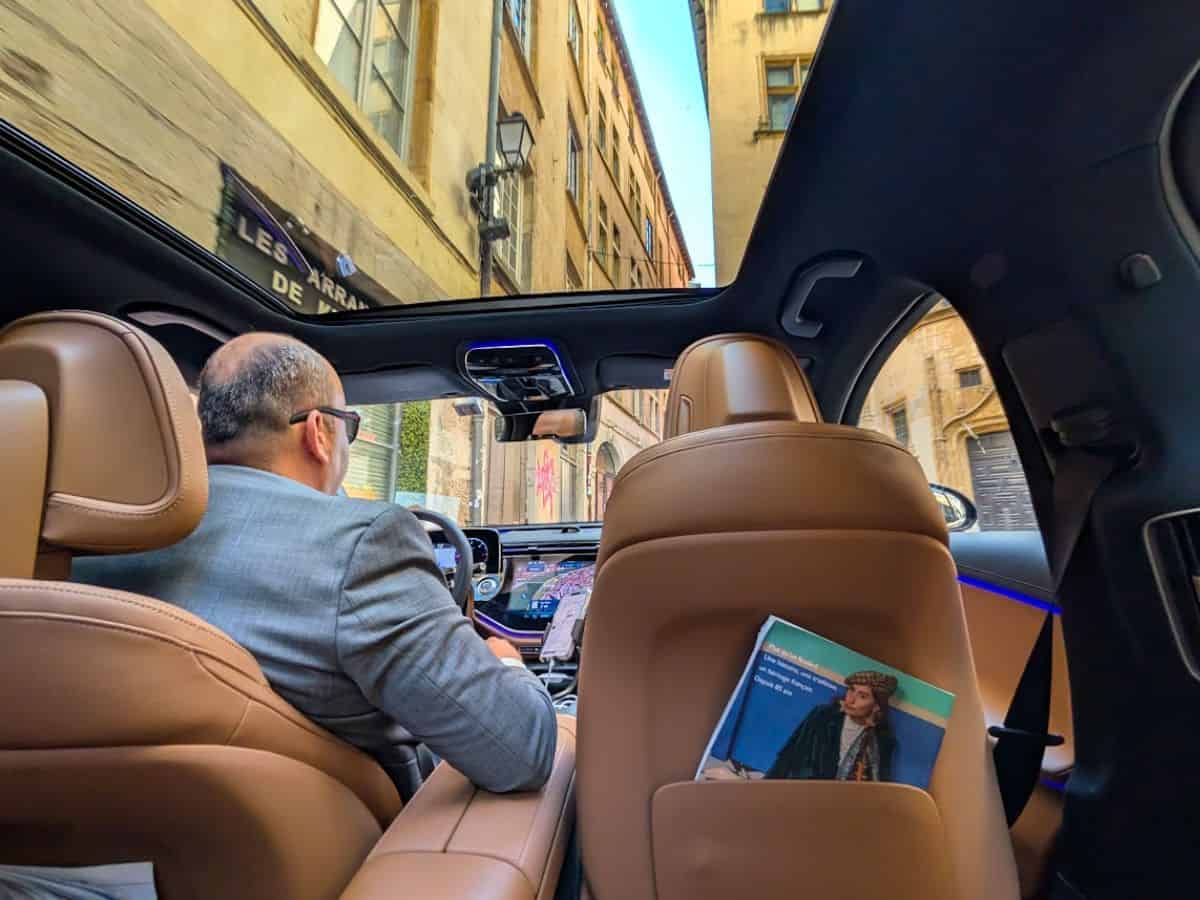 A man in a suit drives a modern car with tan leather seats and a panoramic sunroof, while a book about luxury river cruises rests on the front passenger seat. A bustling riverside city street is visible outside.