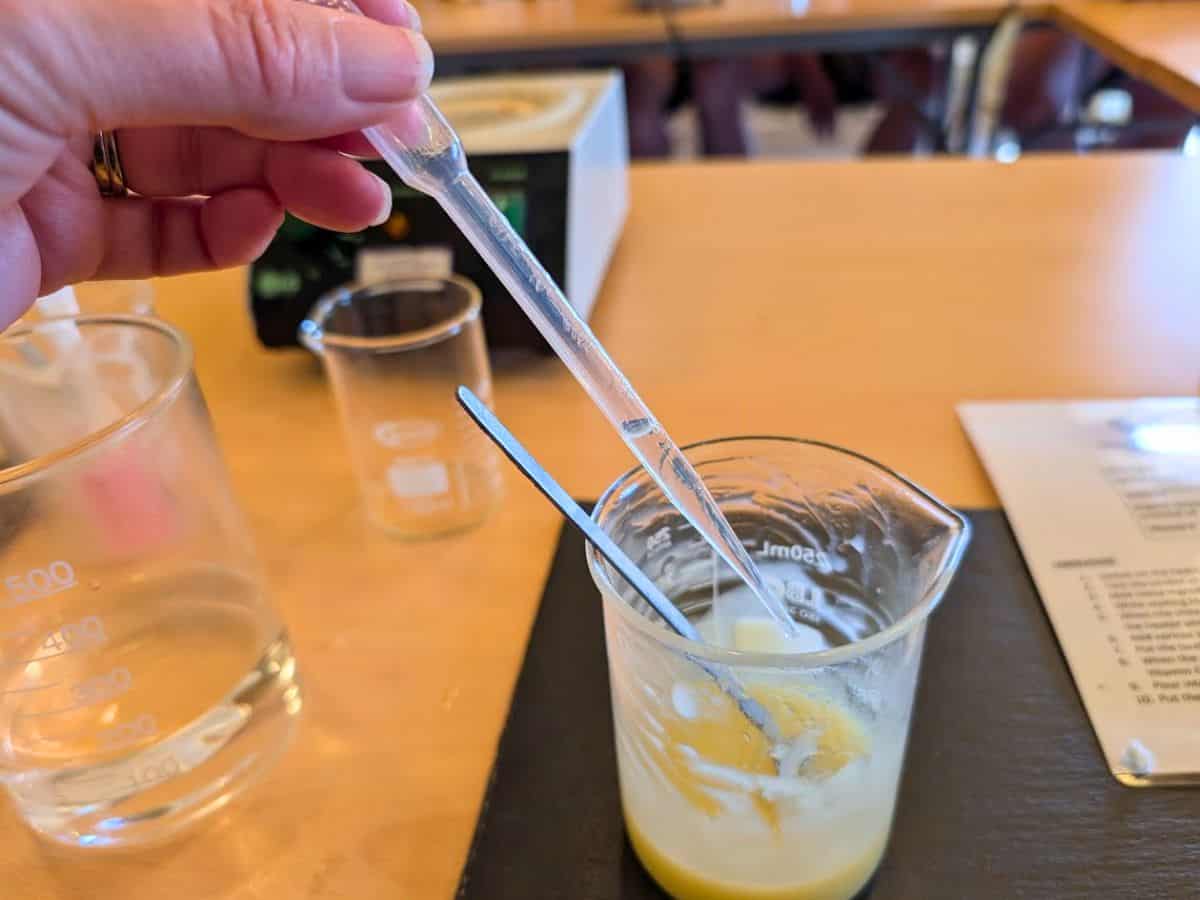 A hand uses a dropper to add liquid to a beaker containing a yellowish mixture; other lab glassware and papers are on the table, evoking an experiment along the scenic Riverside.