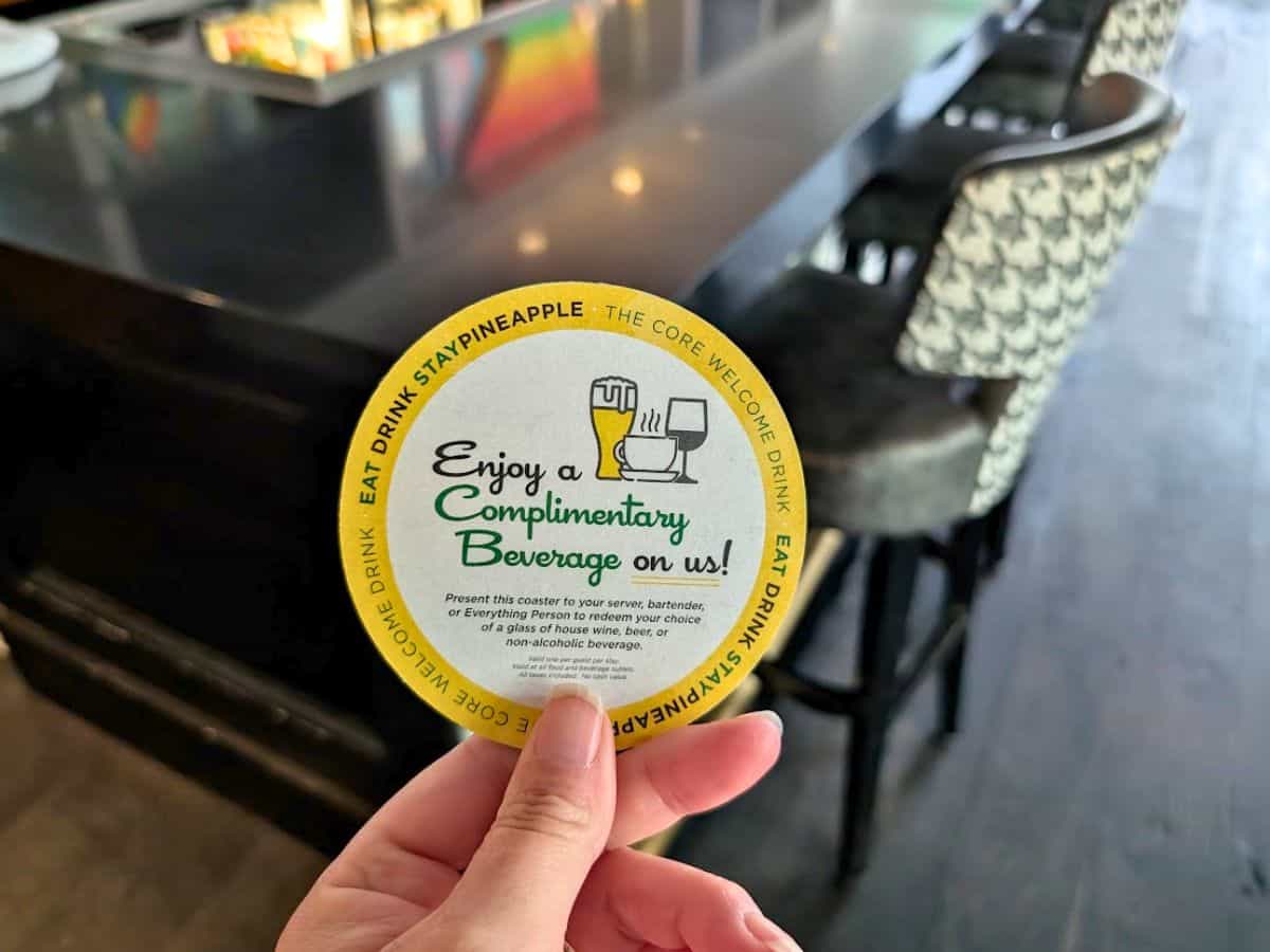 I absolutely love so many of the fun amenities you find at Staypineapple. For example, when you check in, you get a coaster that is good for a welcome drink at the bar.